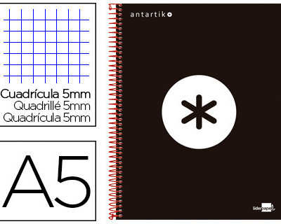 CAHIER SPIRALE LIDERPAPEL SÉRI E ANTARTIK A5 148X210MM 120F 100G/M2 QUADRILLAGE 5MM 6 TROUS COIL-LOCK COLORIS NOIR