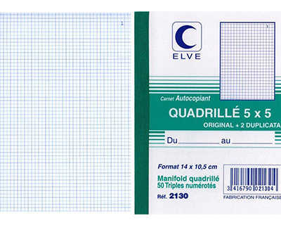 MANIFOLD AUTOCOPIANT ELVE 105X 148MM QUADRILLA 5X5 FOLIOTAGE 50 TRIPLIS Soit : 3 € HT l'unité UMV : 10