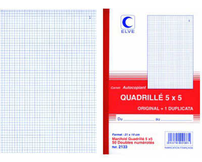 MANIFOLD AUTOCOPIANT ELVE 140X 210MM QUADRILLA 5X5 FOLIOTAGE 50 DUPLIS Soit : 3,42 € HT l'unité UMV : 10