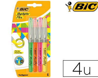 SURLIGNEUR BIC FLEX HIGHLIGHTE R GRIP CAOUTCHOUC POINTE PINCEAU SOUPLE 2 LARGEURS DE TRAIT COLORIS ASSORTIS 4 UNITAS